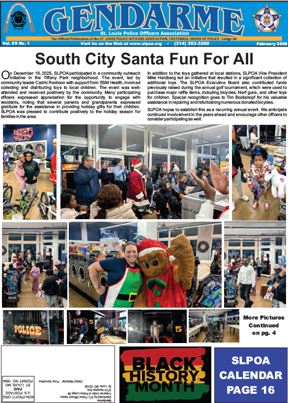 01/30/26 - Saint Louis Police Officers Association The results from the CBA ratification votes are as follows: Police Officers Yes – 247 No – 6 With two additional Yes votes from non-members. This represents a 51% participation rate from police officers. Sergeant Yes – 59 No – 0 With two additional Yes votes from non-members. This represents a 71% participation rate from Sergeants. |